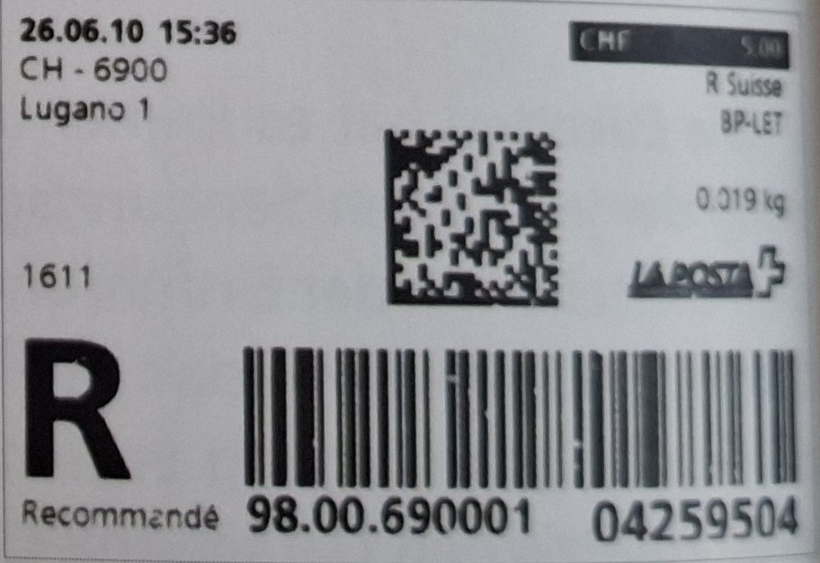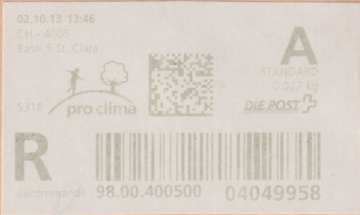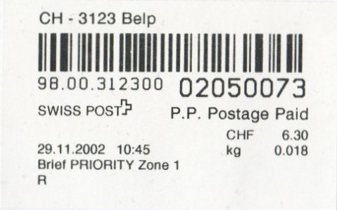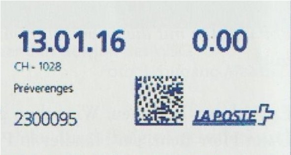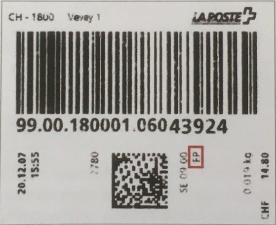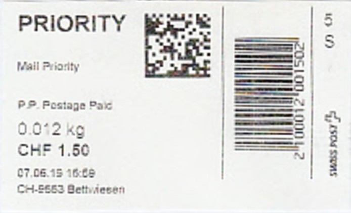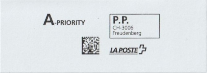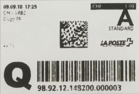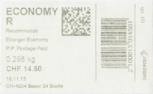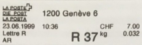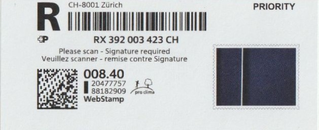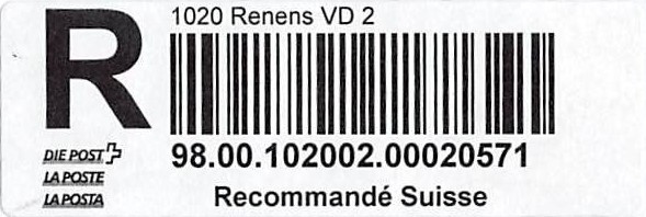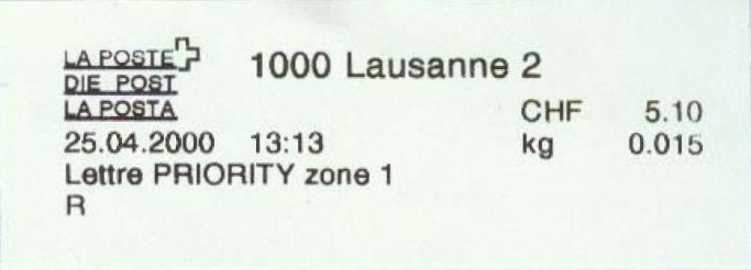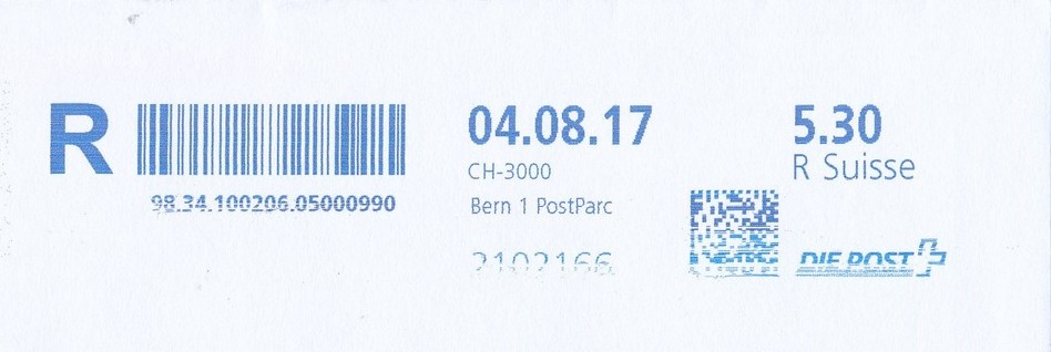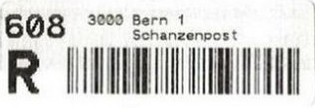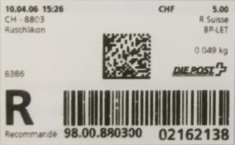 | | Die Verwendungsarten sind vielfältig und die unten aufgeführten Zettel wurden auf unterschiedlichen Maschinen (Freistempel- und Schaltergeräte, Digital oder Webstamps) erstellt. Darüber hinaus weisen diese Etiketten verschiedene Merkmale auf (mit/ohne Barcode oder QR-Code, Erklärungscode, Post-Logo, Höhe des Grossbuchstabens „R“ etc.). | |