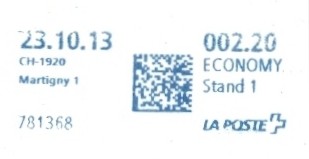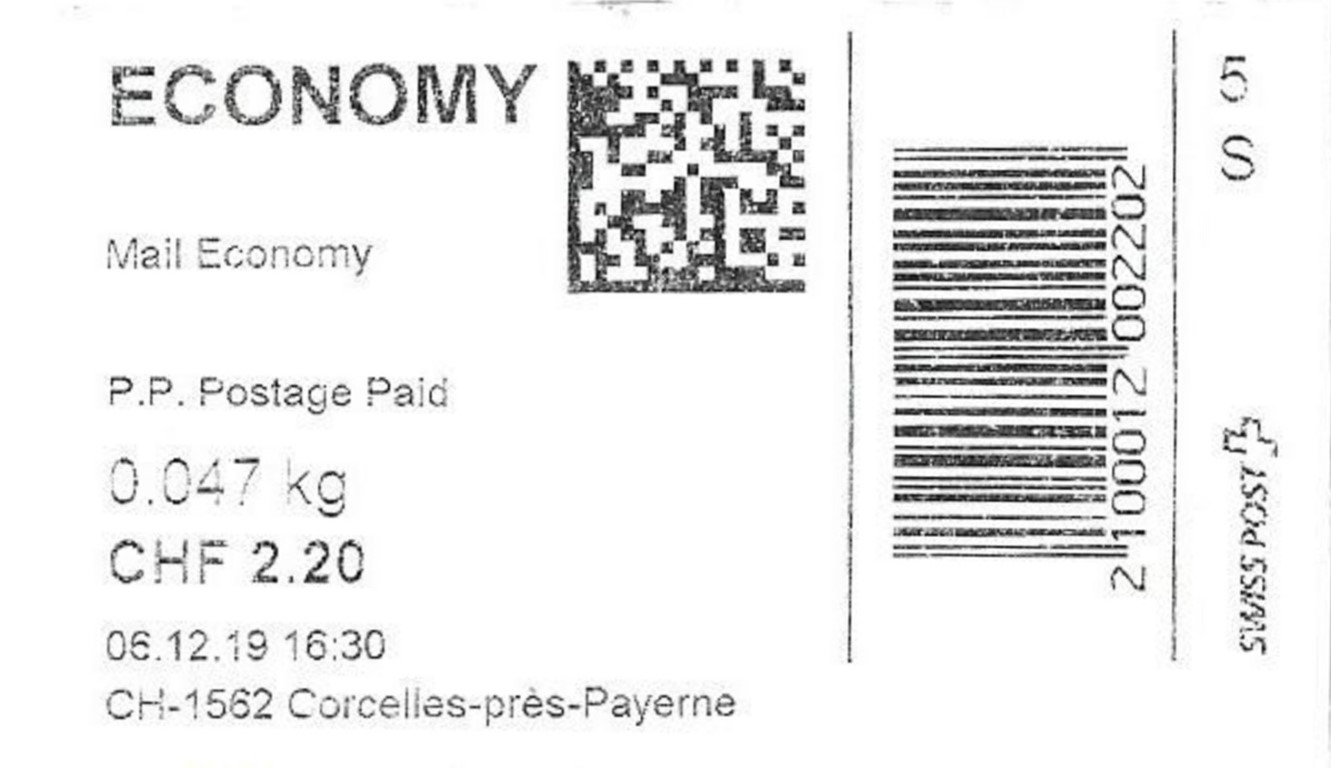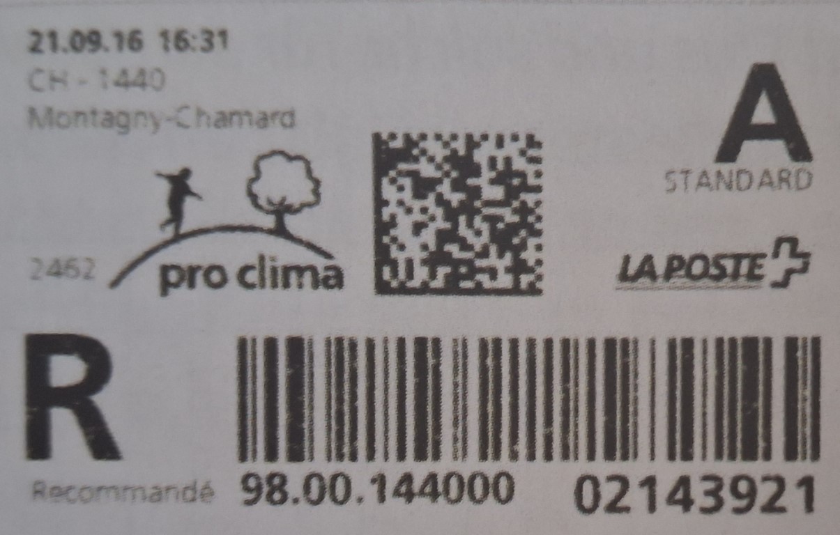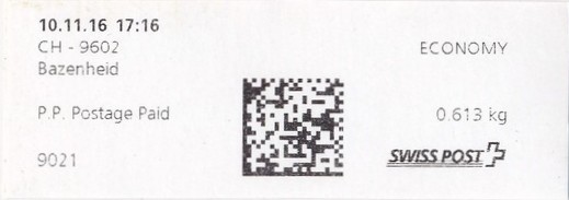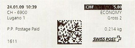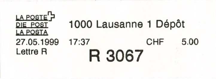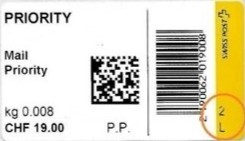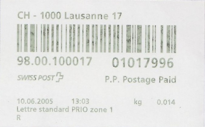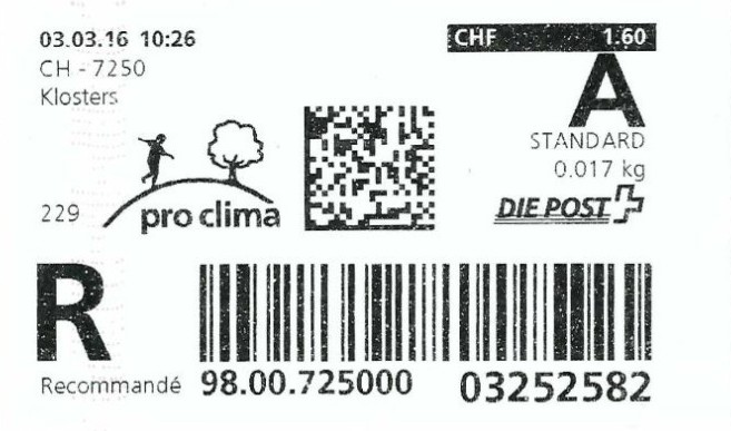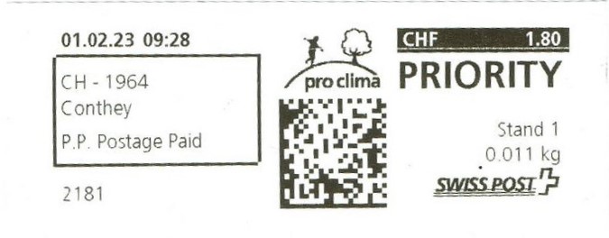 | | Die Verwendungsarten sind vielfältig und die unten aufgeführten Zettel wurden auf unterschiedlichen Maschinen (Freistempel- und Schaltergeräte, Digital oder Webstamps) erstellt. Darüber hinaus weisen diese Etiketten verschiedene Merkmale auf (mit/ohne Barcode oder QR-Code, Erklärungscode, Post-Logo, Höhe des Grossbuchstabens „R“ etc.). | |