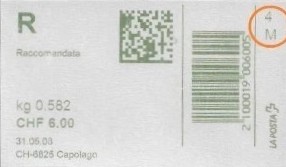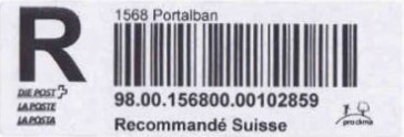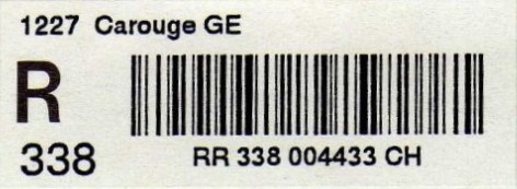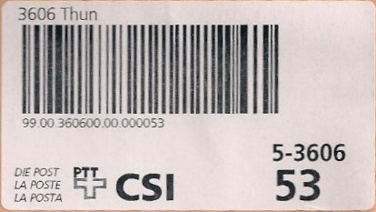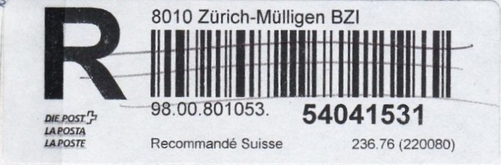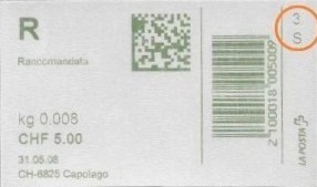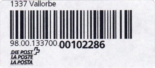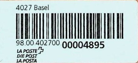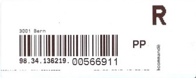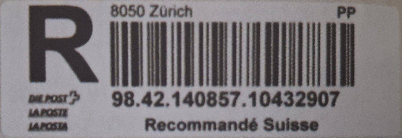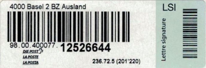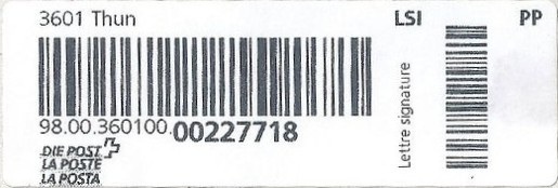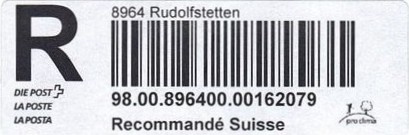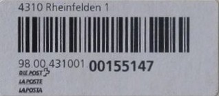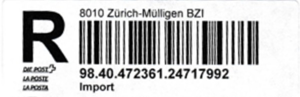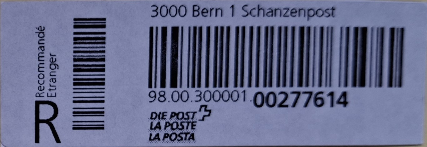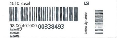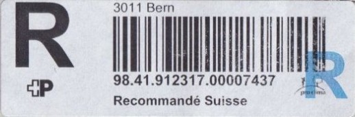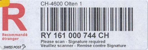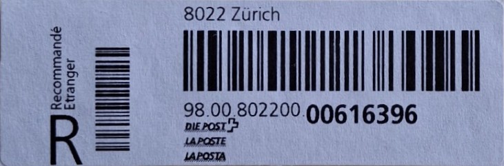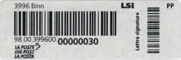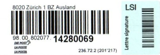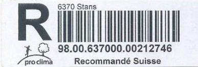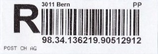 | | | - "RR 000 000000 CH" ========= (2x2 Buchstaben und 3 und 6 Ziffern) | E-Code |