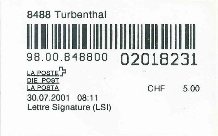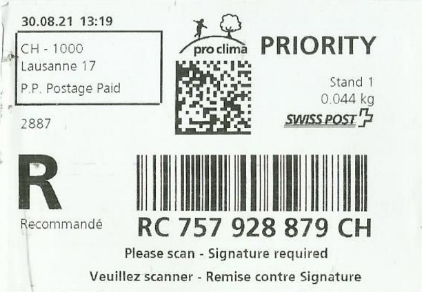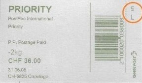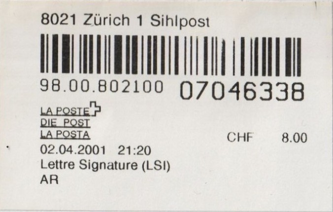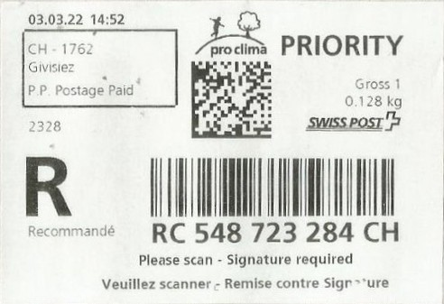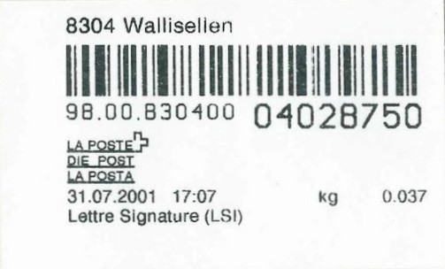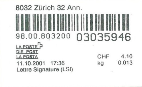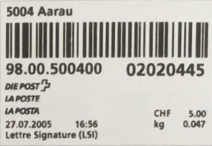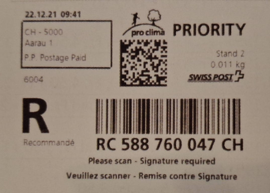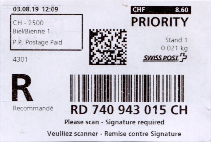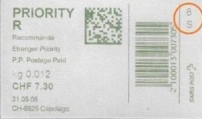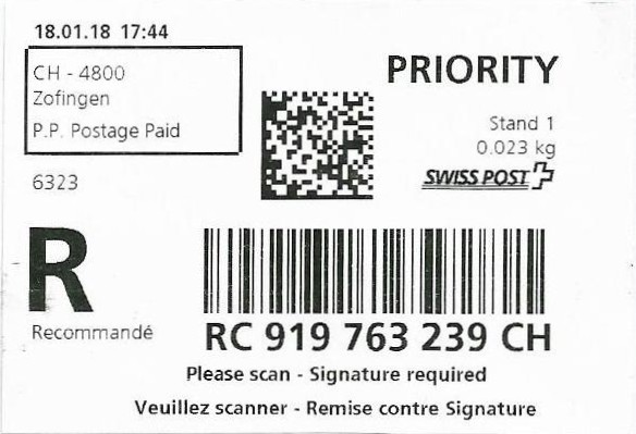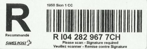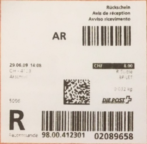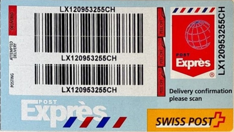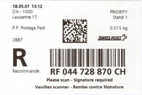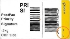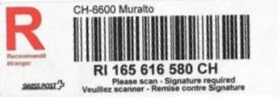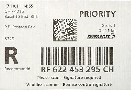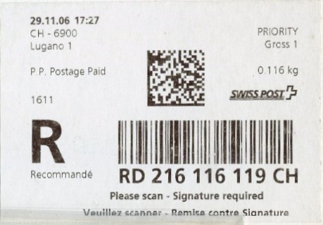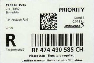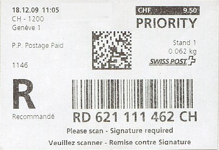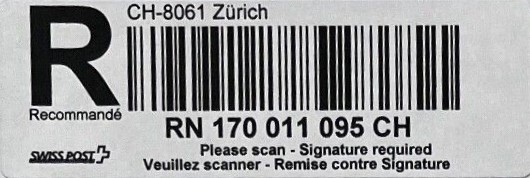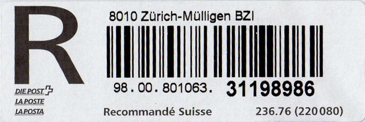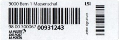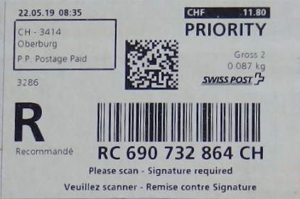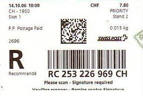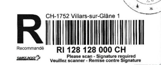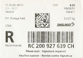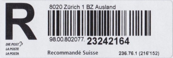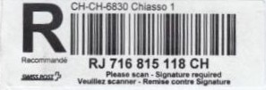| | | - "RC 000 000 000 CH" ======== (2x2 Buchstaben und 3x3 Ziffern) | E-Code |
