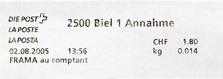 | | 1923 begann man mit dem Druck von „ovalen Poststempeln“, zuerst auf Franco AG-Maschinen, später auf Hasler-, Universal- und Safag-Machinen. 1929 wurde dieser durch einen niedrigeren rechteckigen Wertrahmen ersetzt; ab 1969 kamen geänderte Wertrahmen mit Schraffur um die Eckfiguren (Schweizer Kreuz und Posthorn) hinzu. Den Nutzern wurde erlaubt, ihre alten Maschinen weiterhin zu verwenden. | |
