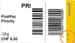 | | | - mit "CH" vorabgehend an den Postleitzahl mit Poststelle (eingekaderd) | P=stelle |