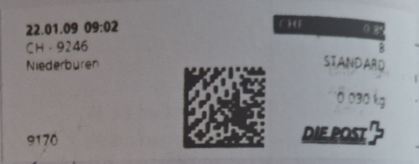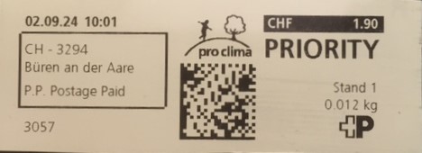 | | | - Angabe Portokosten CHF 0.00 in einem schwarzen Feld mit weissen Ziffern | CHF |