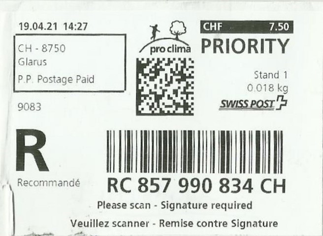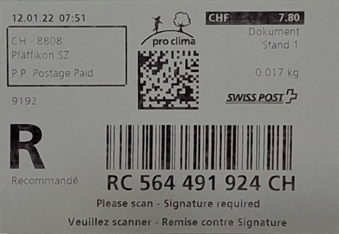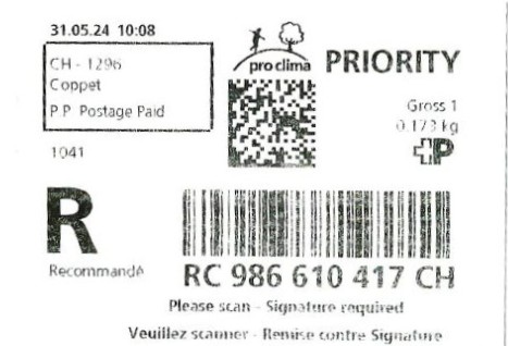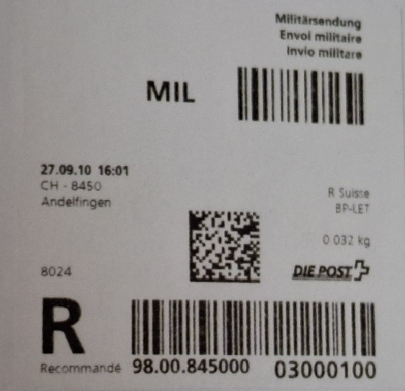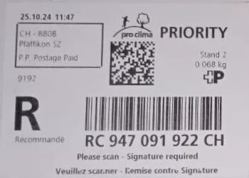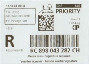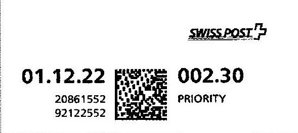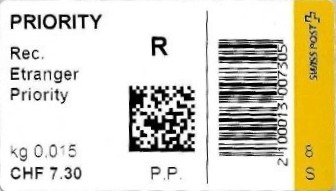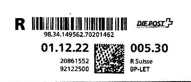 | | | R - Priority mit Barcode und QR-Code | Barcode Erklärungscode RX 000 000 000 CH // QR - Erklärungscode + |00000000 |00000000 |