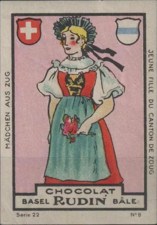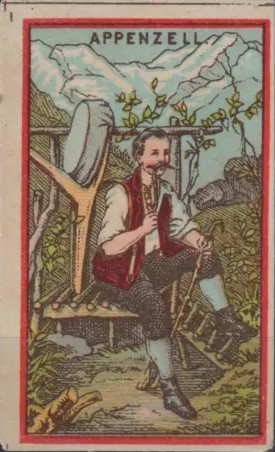 | | Dieses Sammlerbild erschien vor 1914 und war Teil einer Serie von 50 verschiedenen Ländern. Das Foto zeigt einen Mann oder eine Frau in traditioneller Tracht mit Nationalflagge und Nationalwappen. Die Schweizer Figur zeigt eine Frau mit Hut. | |